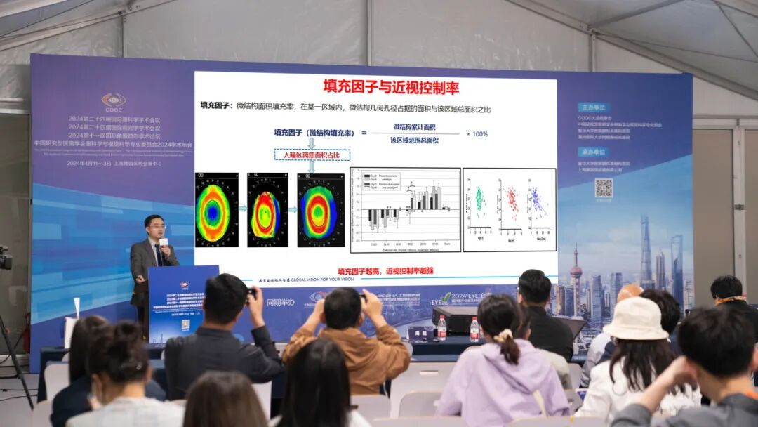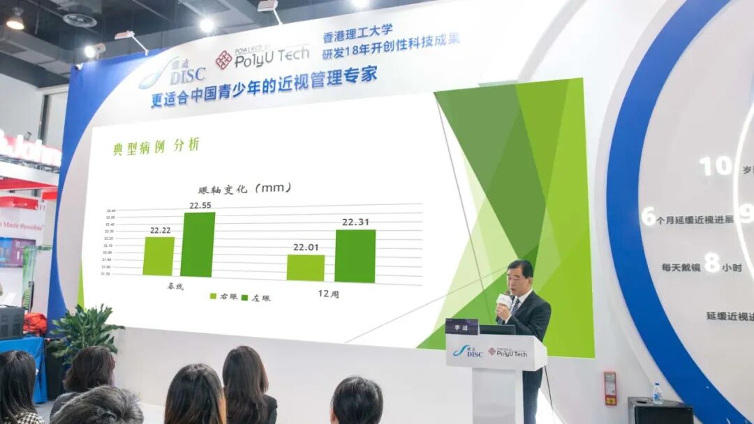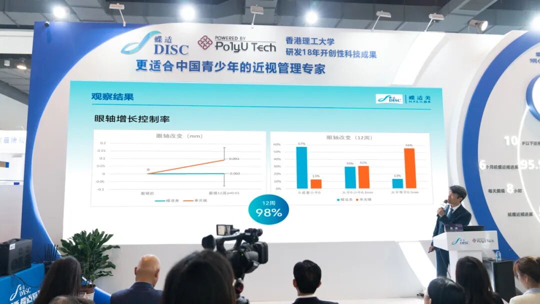 左冰教授就微透精嵌镂空离焦技术(.M.P.E.H.)进行了详细讲解。该创新技术使得镜片的离焦区面积突破性地达到68%以上,不仅有可能达到更好的近视管理效果,通过“小孔成像”原理也保证了良好视觉质量,经过12周的真实世界研究,配戴蝶适美(DISCmate)微透精嵌镂空近视管理镜片,可延缓眼轴增长高达98%。这是继蝶适(DISC)9同心双焦软镜之后,又一个科研技术创新产品,期望近视管理效果再上新台阶,造福近视青少年。
