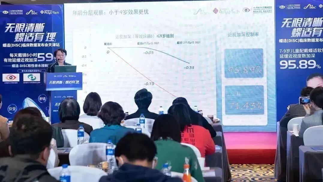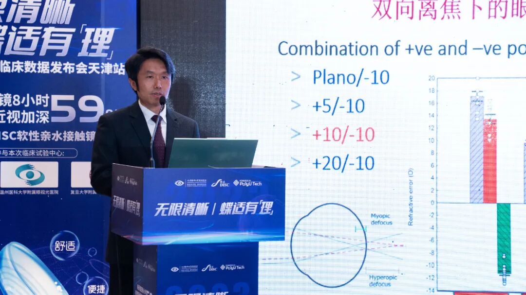 中国眼谷蝶适近视防控光学技术研究院暨香港理工大学DISC科技(蝶适)研究中心负责人左冰教授在从研发初心、动物实验和临床试验研究过程,充分阐述了蝶适9同心双焦软镜的研发历程,深入剖析了蝶适9同心双焦软镜的"光学离焦"设计原理以及“多环离焦”的近视防控技术。根据香港理工大学为期两年的测试和研究发现,佩戴时间与效果呈现正相关,每天佩戴八小时以上,平均可减缓近视加深60%。