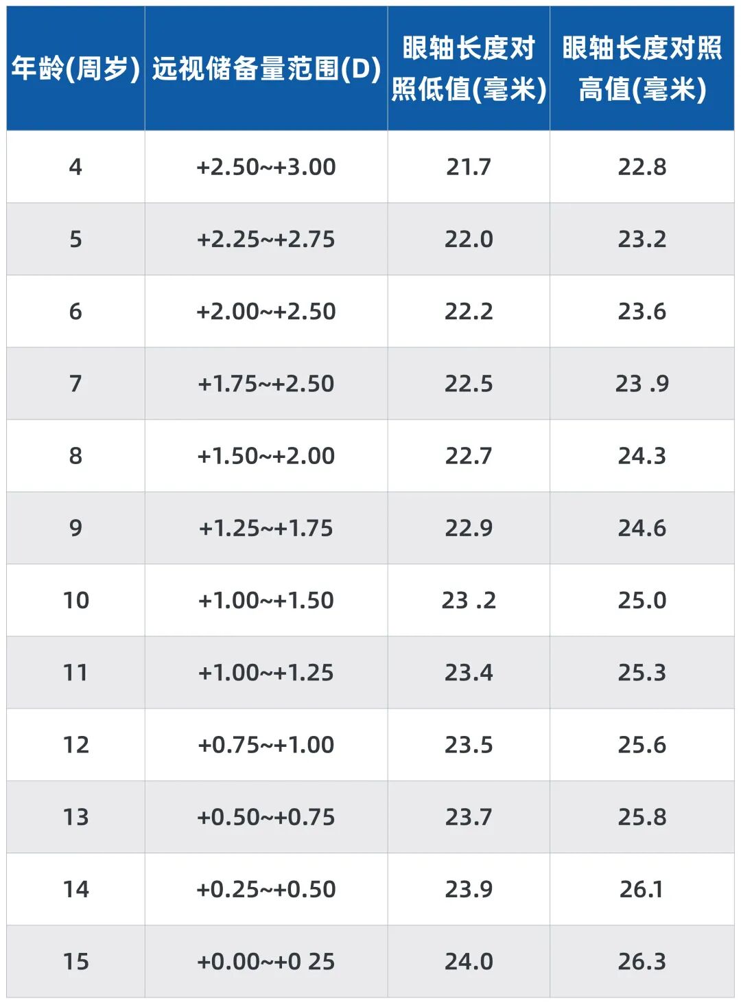 裸眼视力正常,屈光正常,远视储备量在对应年龄参考值范围内,眼轴长度在对应年龄低值以下。