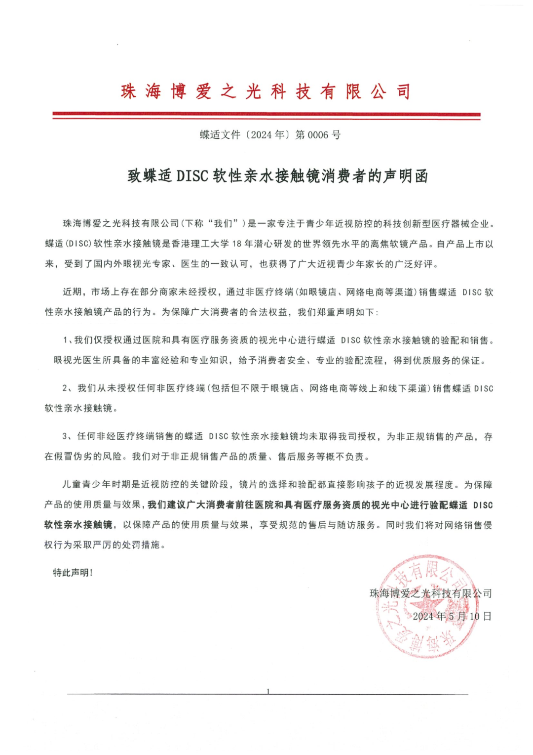 近期,市场上存在部分商家未经授权,通过非医疗终端(如眼镜店、网络电商等渠道)销售蝶适 DISC软性亲水接触镜产品的行为。为保障广大消费者的合法权益,我们郑重声明如下: